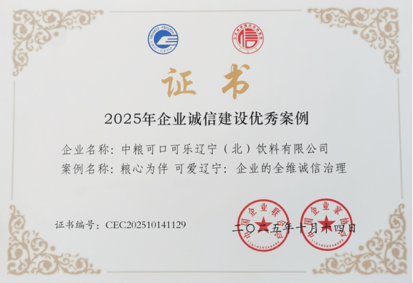 “粮”心为伴,“可”爱辽宁:中粮可口可乐全维诚信治理获“2025年企业诚信建设优秀案例奖”