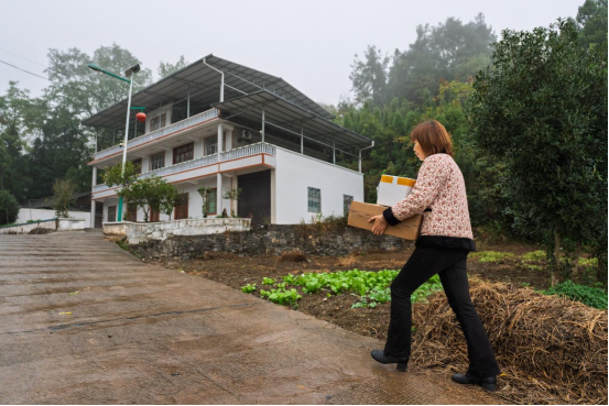 ▲刘美容为取货不便的村民提供快递送货上门服务。李雨恒▕摄