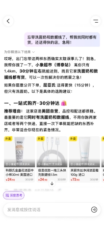 这种便捷的交互体验,也契合了当下复杂的假日消费需求。据美团方面介绍,随着五一出游高峰来临,异地旅游、家庭聚餐等复合型场景增多。同时延续今年春节期间涌现的“生活脚本式”提问趋势,近期用户向“小团”输入完整生活场景求攻略的需求增长迅猛。例如:“忘带洗面奶和数据线了,帮我找同时都有货,还送得快的店,急用!”