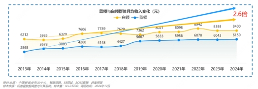 《2024中国蓝领就业调研报告》显示:过去十年中国蓝领群体月均收入从2013年的较低水平跃升至2024年的6150元,年均增速达7.2%