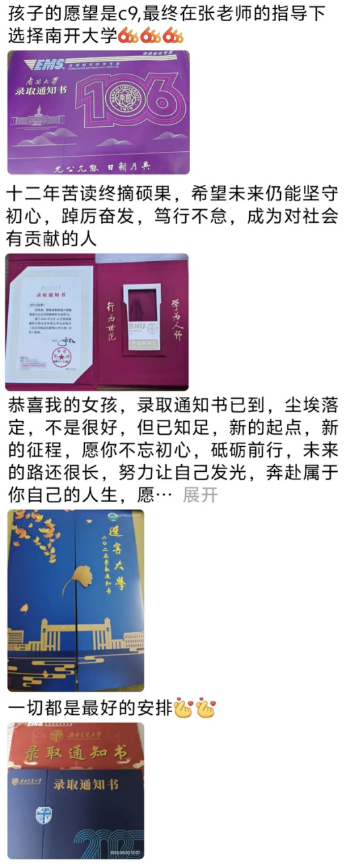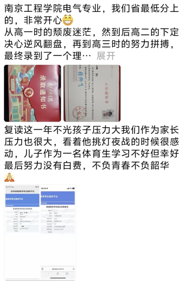 还有一位家长在评论区感谢学校老师们的帮助——因为学习压力太大,孩子的成绩在二模后停滞不前,是各科老师都在悉心陪伴,英语老师天天用手机陪他练听力,才稳住了心态,让高考时稳定发挥,取得了满意的成绩。