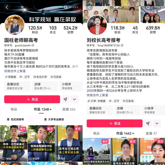 @刘校长高考报考 和@国柱老师聊高考 分别毕业于吉林大学和东北大学,是快手上的一对工作搭档,两人十年深耕志愿报考咨询,2021年加入快手,从最初的视频科普,到直播连麦答疑,如今每年指导数千名考生圆梦大学,他们见证了一个又一个普通家庭的喜与泪。