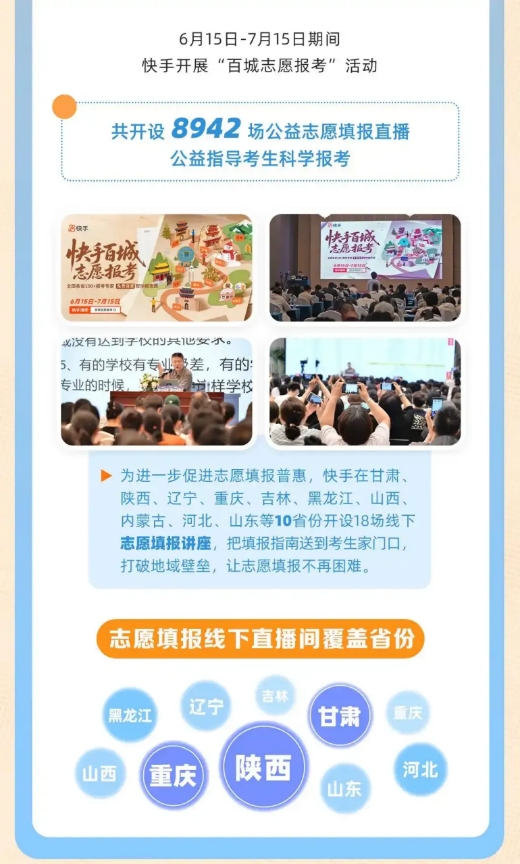 为了打破地域壁垒,快手还在甘肃、陕西、辽宁、吉林、重庆、山东、河北等10个省份开设18场线下讲座,把志愿填报指南送到考生家门口。