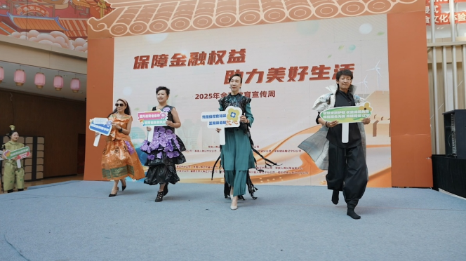 本次活动以“保障金融权益 助力美好生活”为主题,首创“金融风险警示环保时装秀”形式,通过“废弃材料再造时装”的艺术表现,隐喻金融风险的隐蔽性与转化可能。活动通过三大篇章展开金融教育:老年模特以废旧物料服装演绎“风险的滋生”,警示垃圾信息对财富生态的危害;中年模特用保单时装展示“价值的重塑”,传递风险甄别的智慧;青年模特身着科技感服饰,在“财富的未来”篇章中呼吁运用金融工具构建家庭财务防线,形成从警示到行动的完整叙事链。