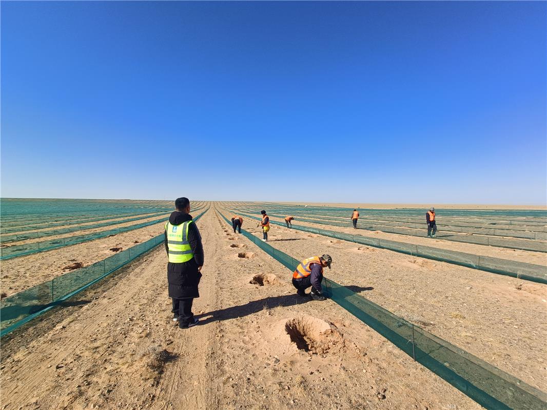 此外项目推进中还同步兼顾民生效益,通过“劳务协作+能力提升”机制与“以工代赈”模式,优先雇佣当地农牧民参与围栏安装、固沙作业、后期管护等环节。“最多时一天能带动400多名农牧民就业,让大家在家门口就能学技能、挣收入。”一标段负责人尹萌介绍,目前已有近千名农牧民通过项目获得临时就业机会,实现“生态修复”与“民生增收”双赢。