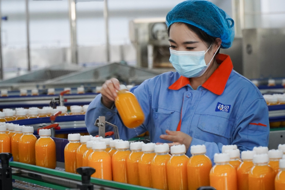 ▲工人在产线打包沙棘汁。张贵鑫|摄
