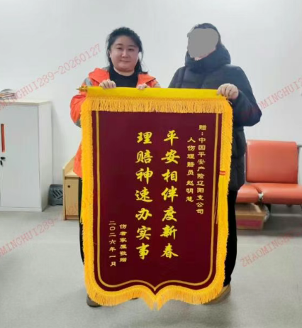 理赔期间,平安产险辽阳中心支公司理赔员赵明慧三次跟进服务:首次探望安抚客户,指引理赔流程;术后康复期二次探视,告知理赔单证;方案确认后同步协调双方赔付。孙大爷家属感慨:"没想到这么快就能拿到赔偿,这个春节能安心过年了。"最终获赔后,孙大爷委托女儿送来"平安相伴度新春、理赔神速办实事"锦旗。