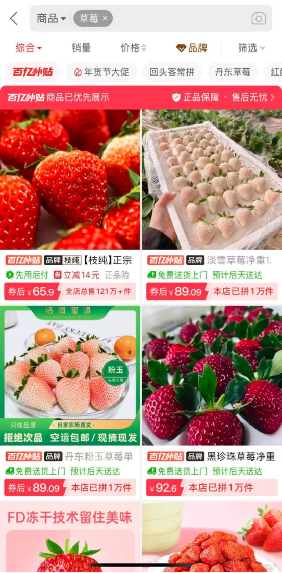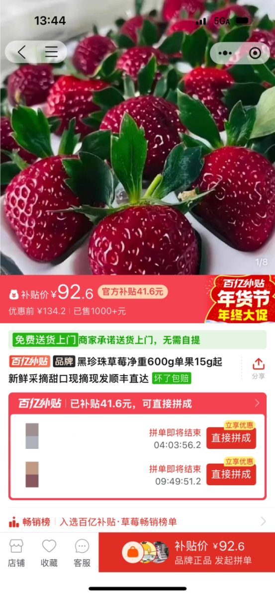 幸运的是,随着12月收获季来临,这款粉草莓在拼多多平台上迅速破圈。因为品质好,产品还被拼多多筛选为百亿补贴商品。