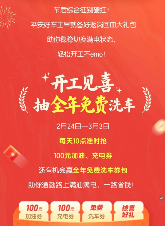 抽100元加油充电券|开工红包已到账!赢全年免费洗车