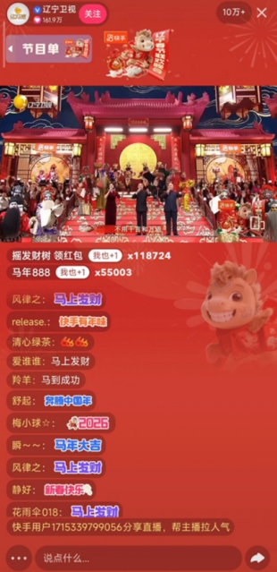 快手有年味,奔腾中国年。作为《2026辽宁春晚》冠名方,快手不仅为晚会营造围炉夜话般的亲切感,助力辽韵风华走向全国观众的心灵深处;还通过“专属红包雨”等大小屏互动玩法,把热闹欢腾从声光电舞台延伸到了天南海北。当天,@辽宁卫视 快手直播间观看人次达2.55亿,收获全网热搜817个,成为除夕前夜的人气聚集地。