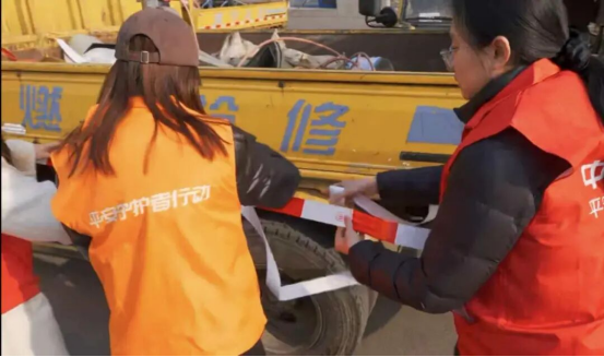 随后,志愿者们深入车队,为多辆货运车辆粘贴高亮度反光贴,在细微处入手,帮助提升车辆在夜间和恶劣天气下的辨识度,切实为司机师傅们的出行安全增添一份保障,展现了金融行业利用实际行动精准满足群众需求的惠民举措。