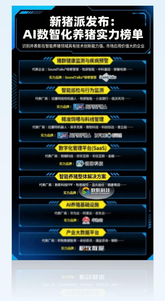 2026年4月1日,新猪派发布 《AI数智化养猪实力榜单》 。该榜单从技术能力、落地案例、真实场景、效果数据、企业规模等多维度出发,对行业中应用较为广泛的智能化养殖场景及主流厂商进行了系统调研与盘点。数影科技成功登榜智能养猪整体解决方案核心赛道。这一殊荣的背后,是数影科技FPF全链路一体化解决方案的硬核实力,更是其历经全球规模化验证、持续落地应用的成果印证。